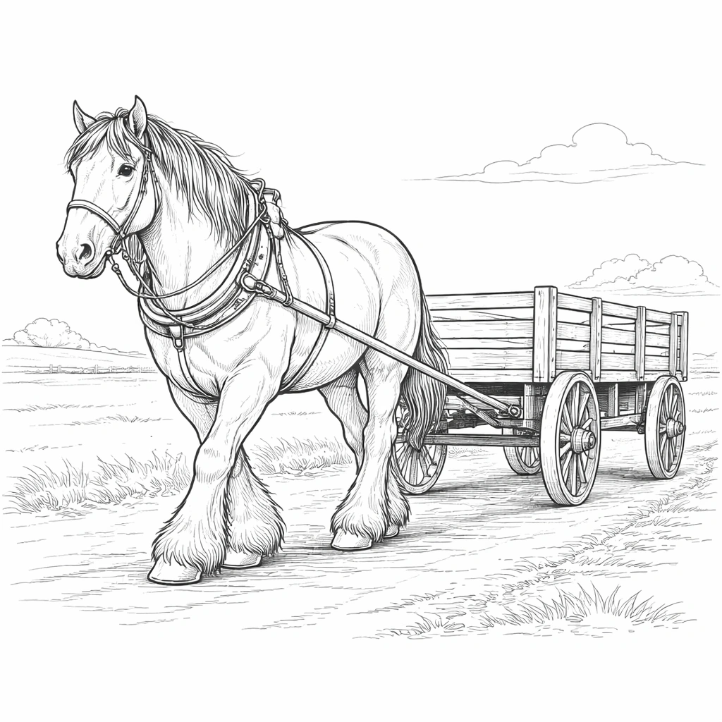 Clydesdale Horse Pulling Wagon Coloring Page