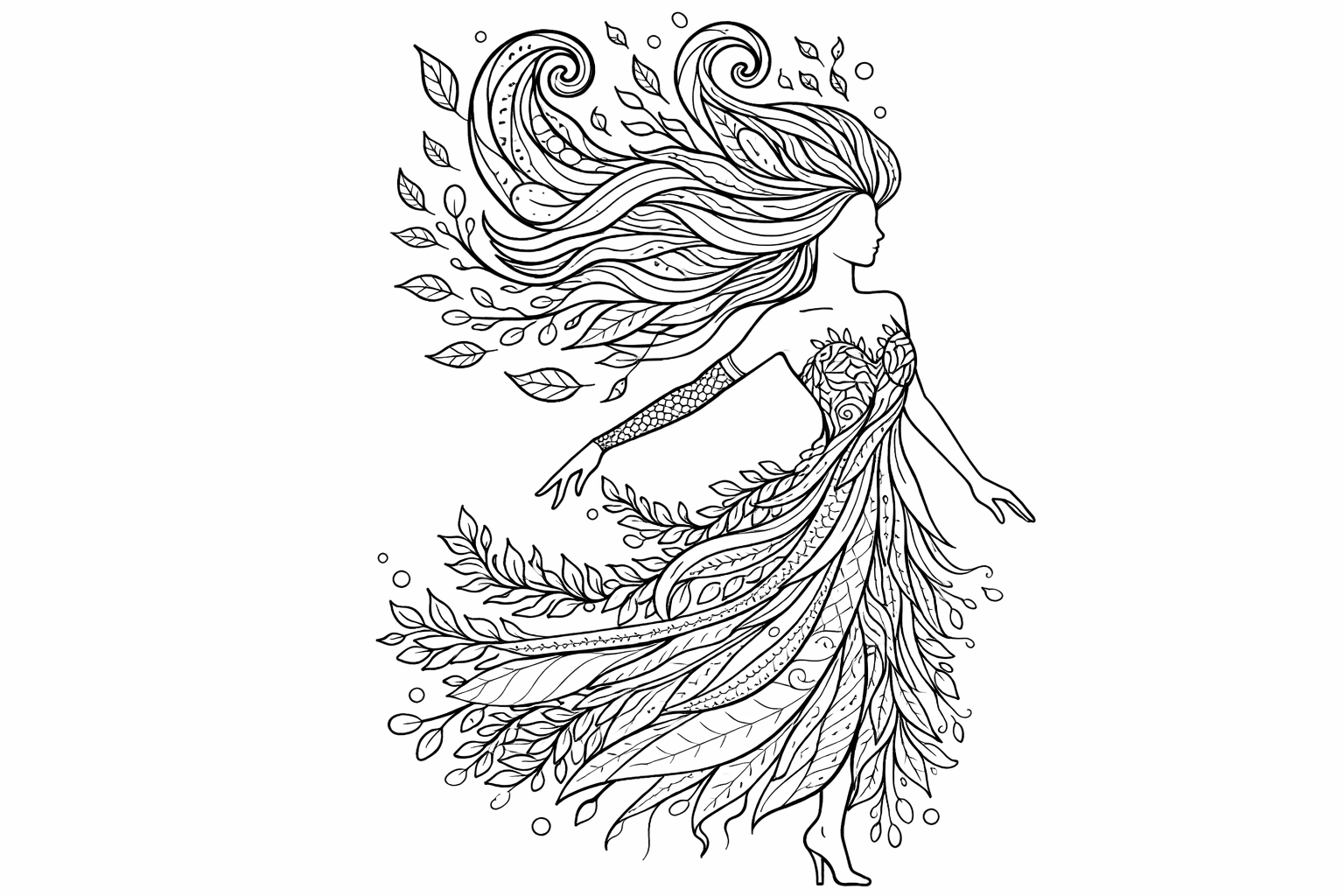 Discover the grounding energy of ‘Earth’s Grounded Harmony,’ a mesmerizing adult coloring book page. This artwork captures the essence of the earth element through the form of a dancer, whose movements reflect the strength and stability of the ground beneath us. Adorned with intricate details such as leaf and vine patterns, a dress reminiscent of layered earth and rocks, and hair that flows like grass, this design invites a deep connection with nature’s enduring spirit. Set against a lush, natural backdrop, this page is perfect for those who find solace and strength in the earth’s steadfast presence. Designed with clear outlines for A4 coloring, it offers a creative journey into the heart of the natural world.