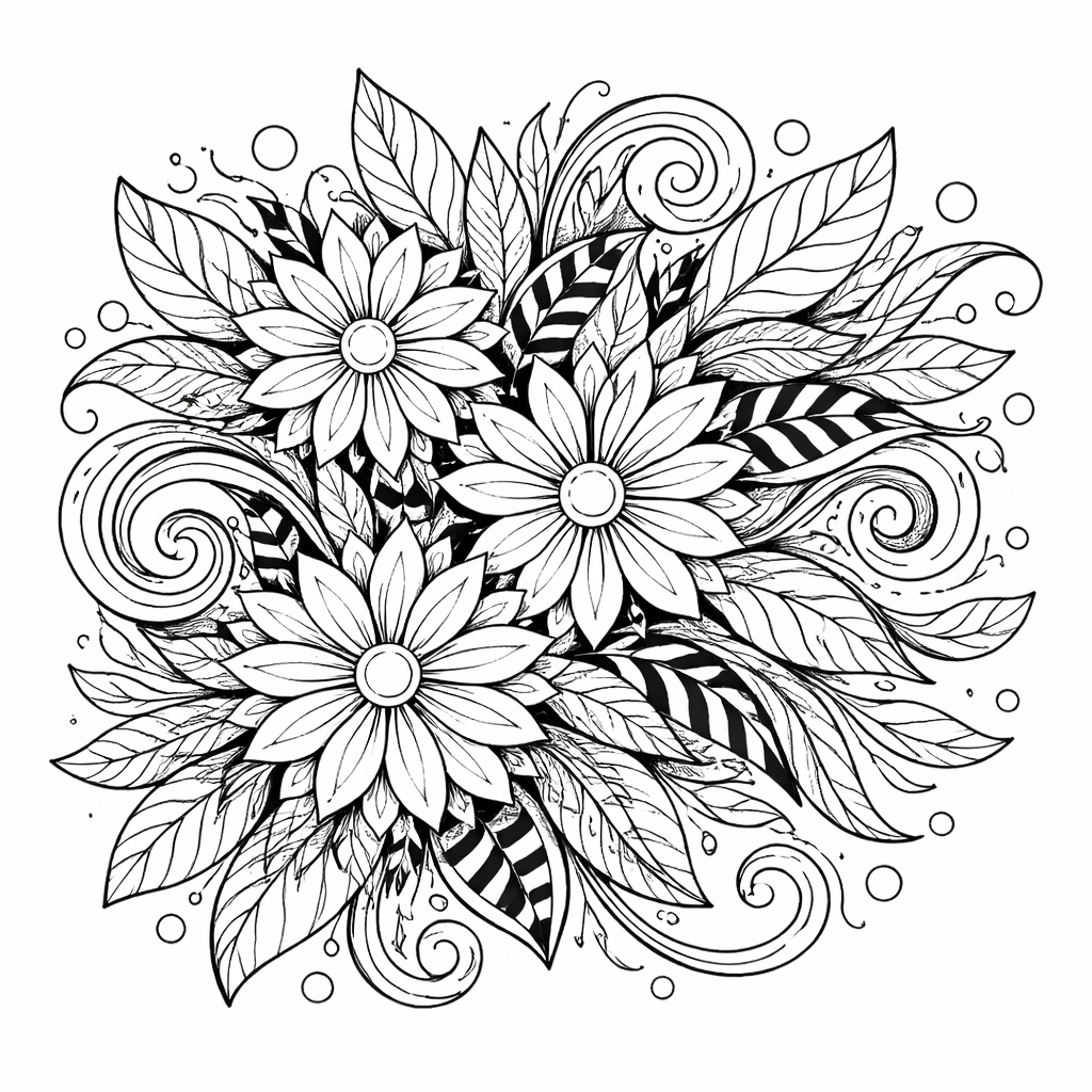 Get lost in the ‘Floral Whirlwind’, a dynamic and detailed adult coloring page. This design swirls with life, featuring a mix of floral elements that create a sense of movement and energy, ideal for art therapy.