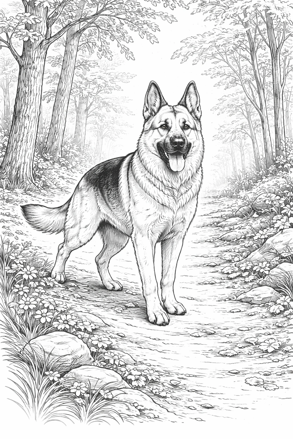 Download a german shepherd dog on forest path coloring page from Creative Coloring World. Enjoy this printable dog design for kids and adults.