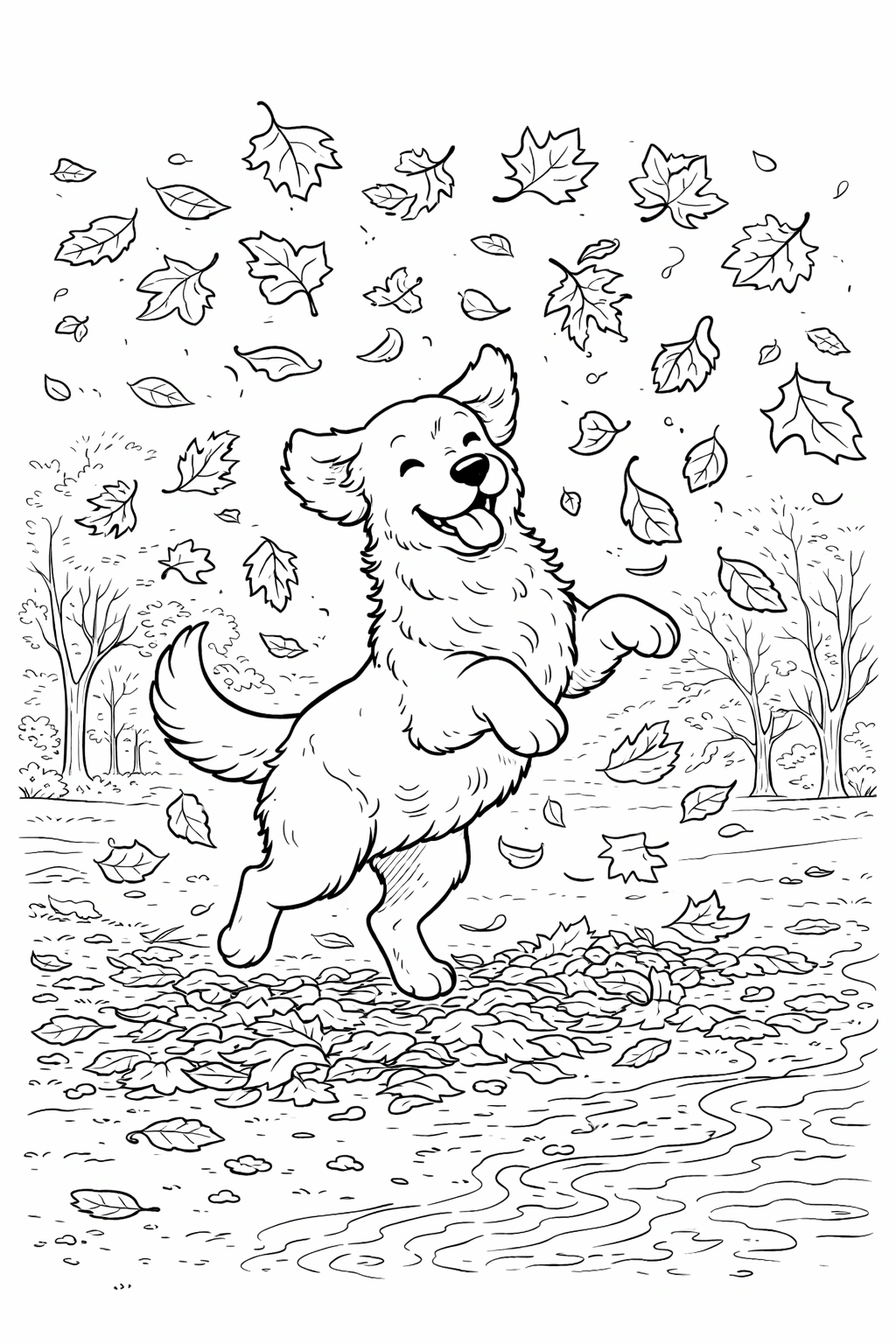 Download a puppy playing in falling leaves coloring page from Creative Coloring World. Enjoy this printable dog design for kids and adults.