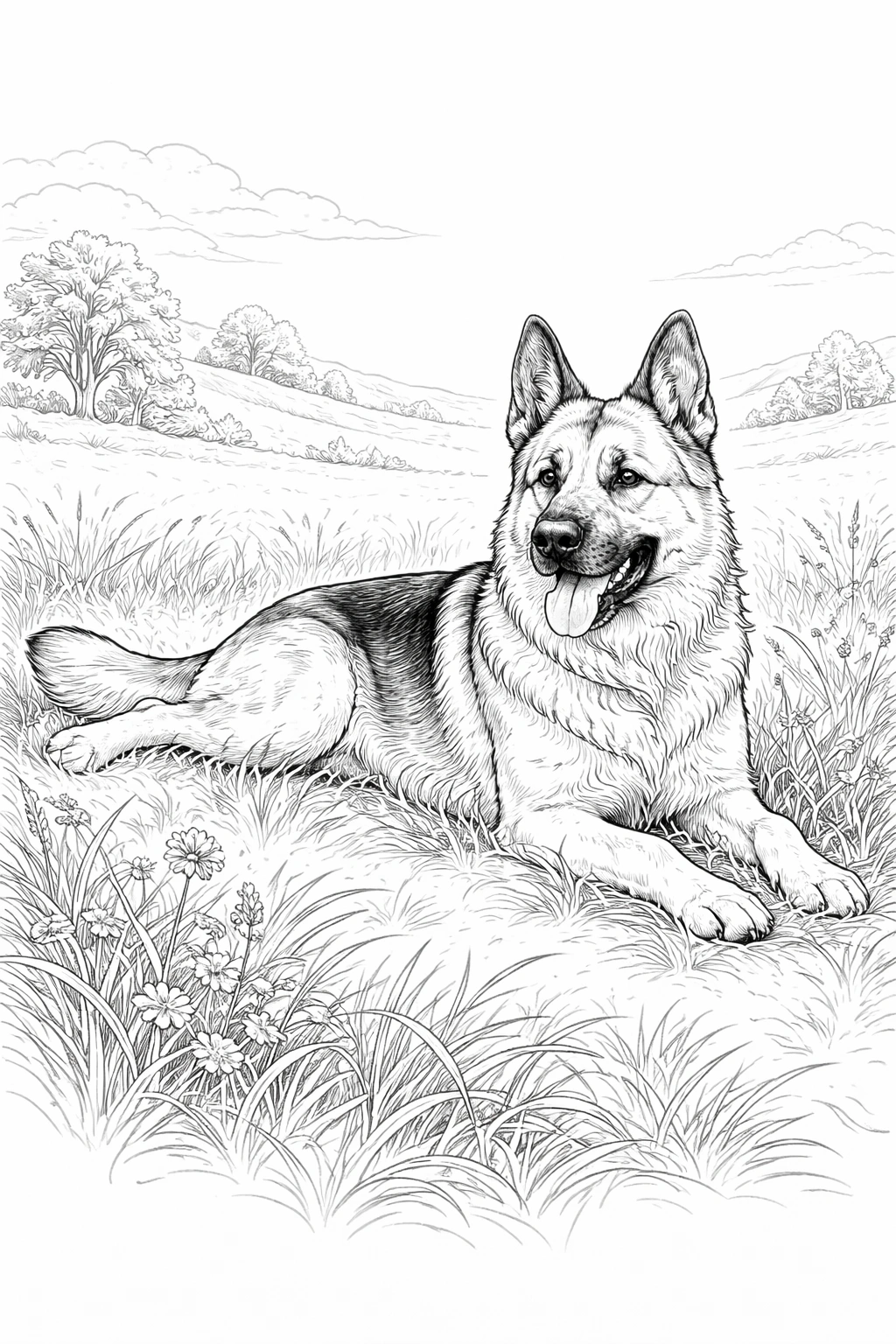 Download a resting german shepherd dog coloring page from Creative Coloring World. Enjoy this printable dog design for kids and adults.