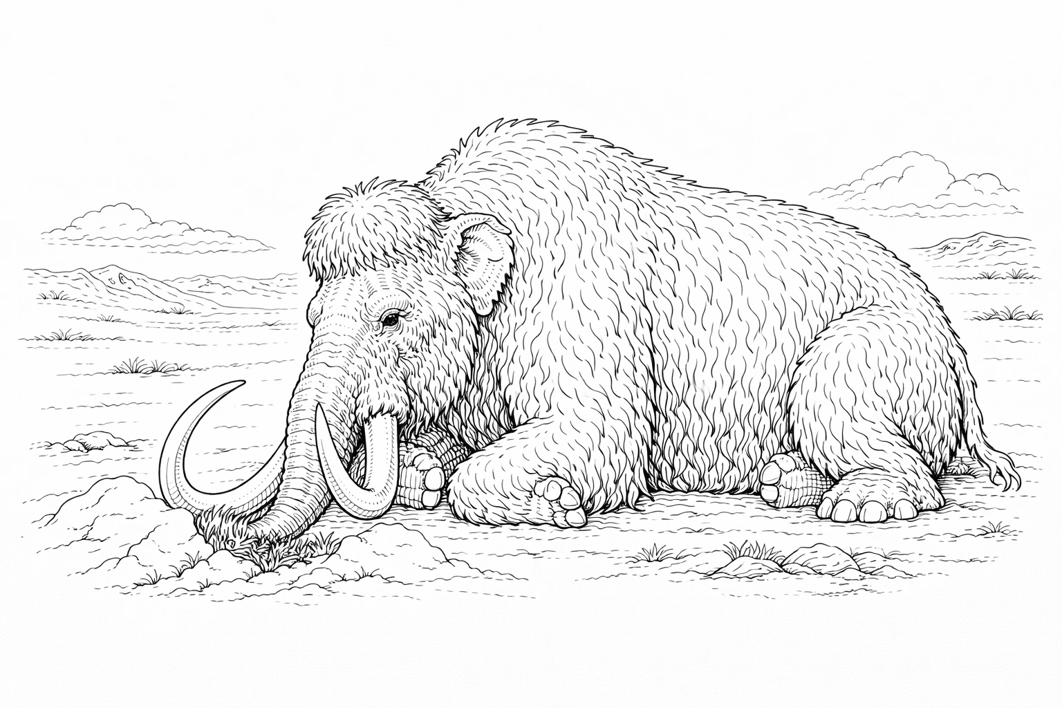 Download a resting woolly mammoth front coloring page from Creative Coloring World. Enjoy this printable woolly mammoth design for kids and adults.