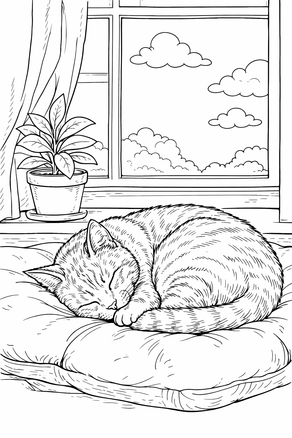 Download a sleeping cat on pillow coloring page from Creative Coloring World. Enjoy this printable cat design for kids and adults.