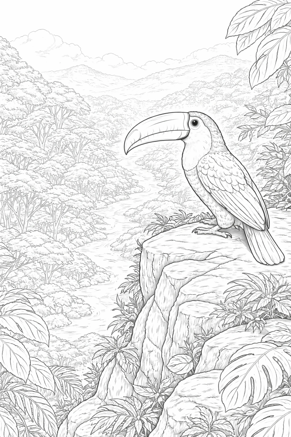 Download a toucan on cliff coloring page from Creative Coloring World. Enjoy this printable toucan design for kids and adults.