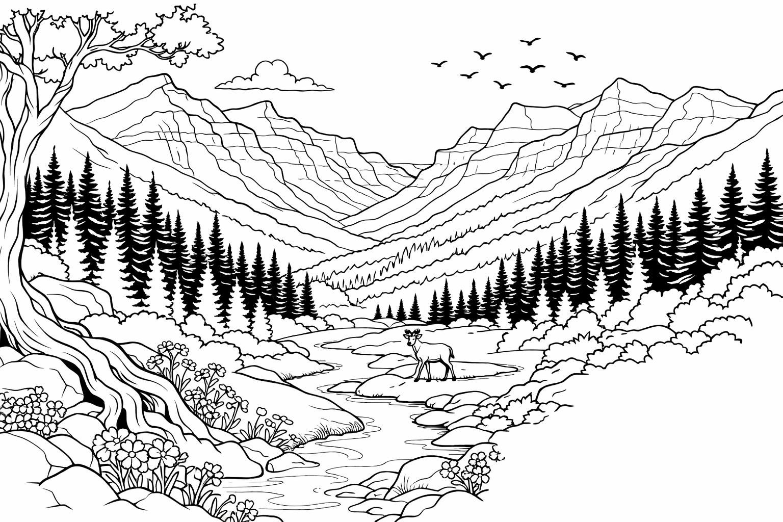 Elevate your coloring experience with the “Trekking Through National Parks ” coloring page, crafted for adults. This intricate black and white outline showcases a detailed and serene national park landscape. It features a rich array of elements such as diverse trees, complex mountain ranges, a winding path, and delicate details like flowers and birds. A hidden waterfall adds to the scene’s depth, inviting a mindful and immersive coloring journey. Perfect for those seeking a challenging and relaxing artistic activity while connecting with the beauty of nature’s vistas.