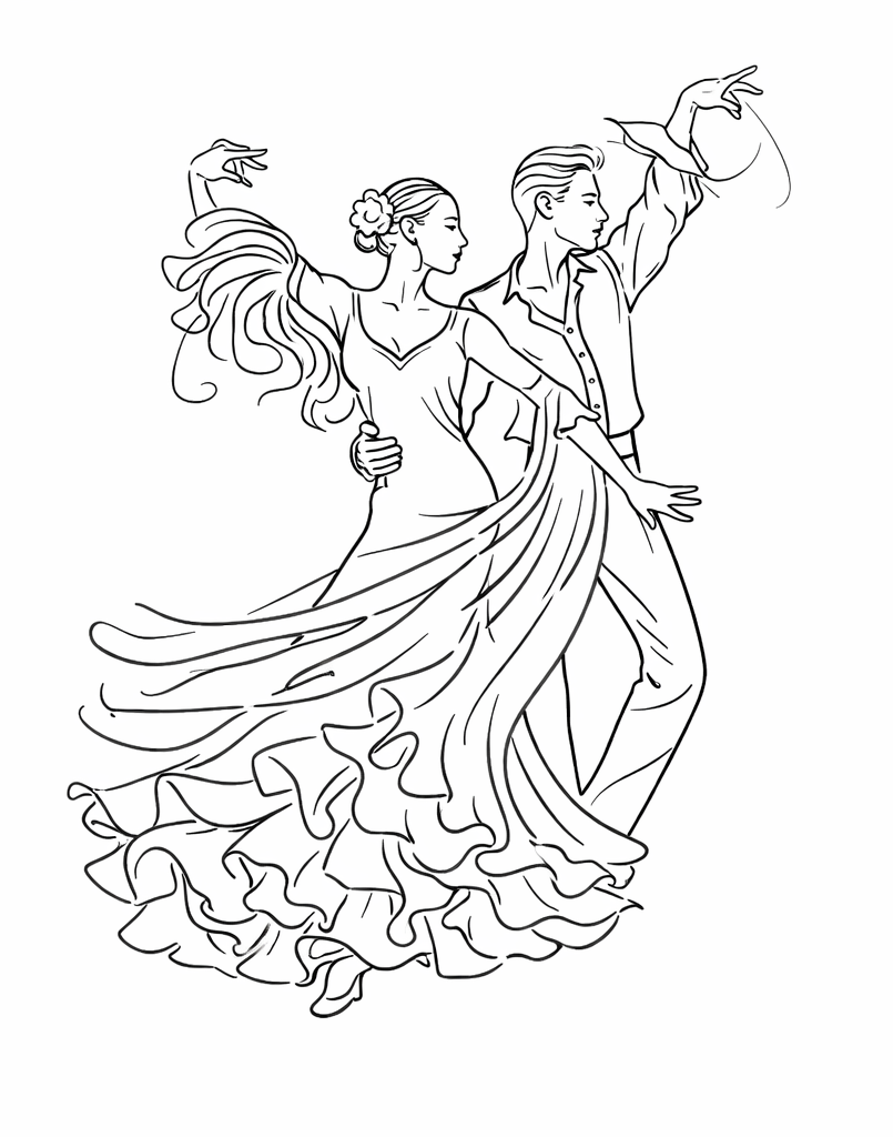 “Flamenco Dance Elegance” is a stunning adult coloring page that captures the essence of the spirited flamenco dance. This black and white line drawing portrays flamenco dancers in a powerful and expressive pose, highlighting the emotional depth and flair of the dance. The intricate detailing of the traditional costumes, including flowing dresses and dramatic poses, offers an engaging coloring experience. Perfect for A4 printing, this page allows adults to dive into the world of flamenco and add their creative touch to these elegant dancers.