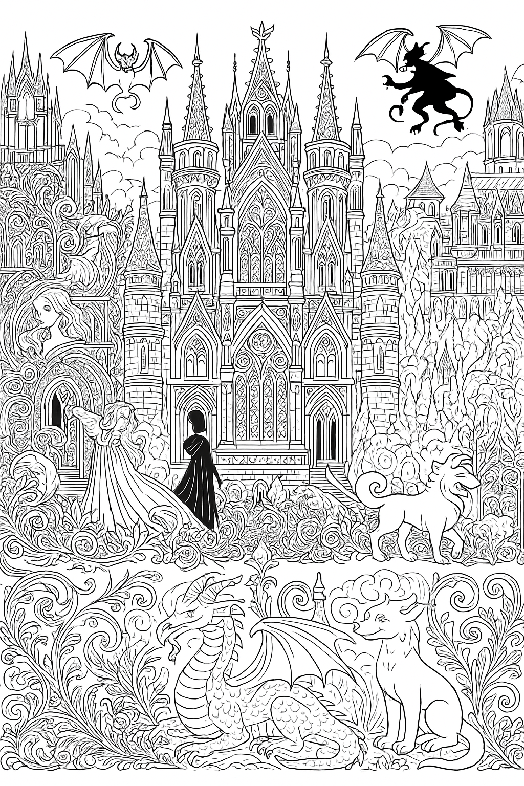 Delve into the dark elegance of our Gothic castles coloring page, where fantasy creatures roam among the spires of hauntingly beautiful architecture.
