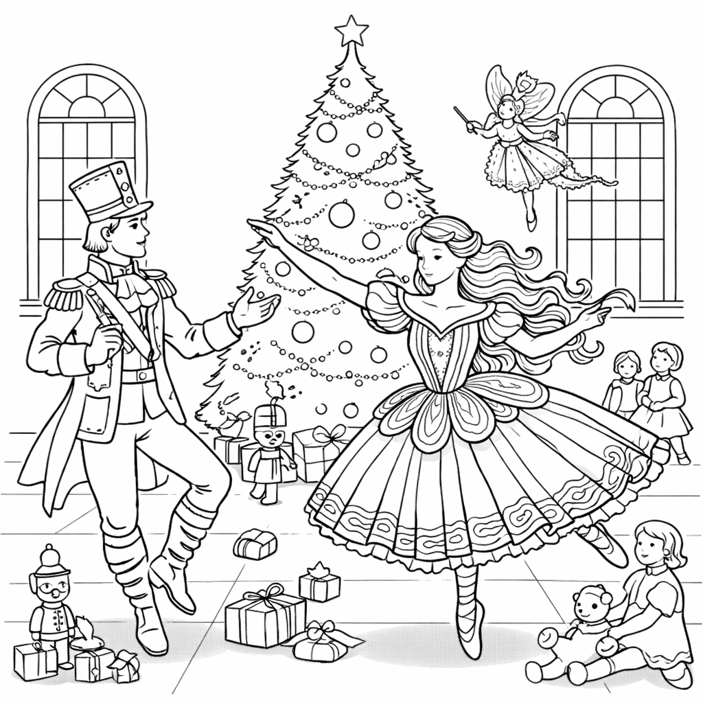 Step into a world of enchantment with our “Magical Nutcracker” coloring page, tailored for adult coloring enthusiasts. This captivating illustration brings to life a classic scene from the Nutcracker ballet, featuring the beloved characters Clara, the Nutcracker Prince, and the Sugar Plum Fairy. Set against a backdrop of a grand Christmas tree and a beautifully decorated stage, this page is filled with whimsical details from the ballet. Designed with clarity and intricacy for A4 printing, this black and white outline is perfect for anyone who enjoys the magic of the Nutcracker and the calming pleasure of coloring.