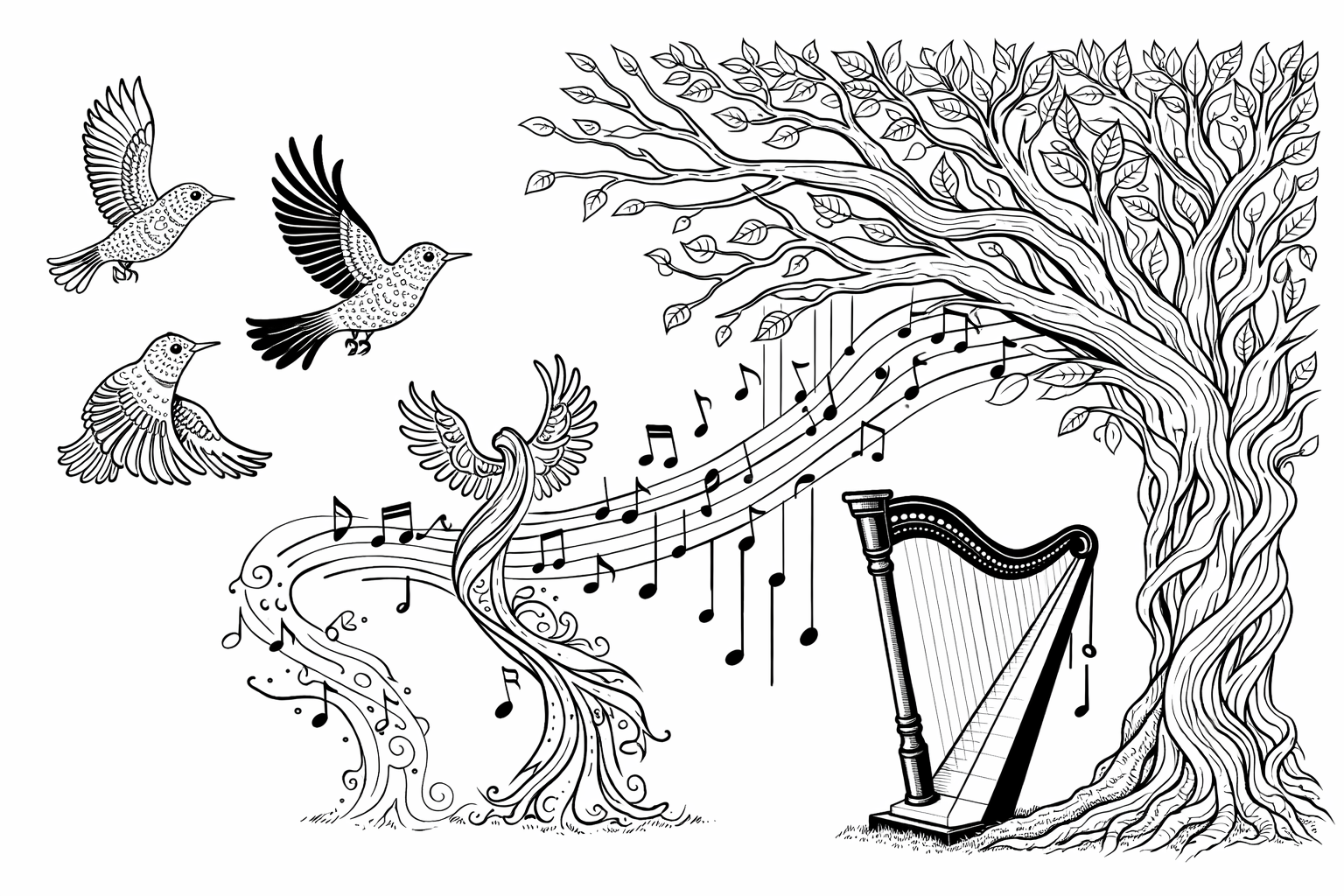 Discover the magical blend of nature and music with ‘Musical Metamorphosis,’ an intricate adult coloring book page. This artwork showcases the stunning transformation of natural elements into musical symbols. Watch a bird as it elegantly turns into flowing musical notes, and a tree as it gracefully morphs into the structure of a harp. The seamless and imaginative transition captures the beauty of both the original forms and their musical alter egos. This page is a celebration of the harmony between the natural world and the art of music, with detailed patterns and elements that invite a thoughtful coloring experience. Ideal for detailed coloring on an A4 page, ‘Musical Metamorphosis’ turns the act of coloring into a symphony of visual transformation.