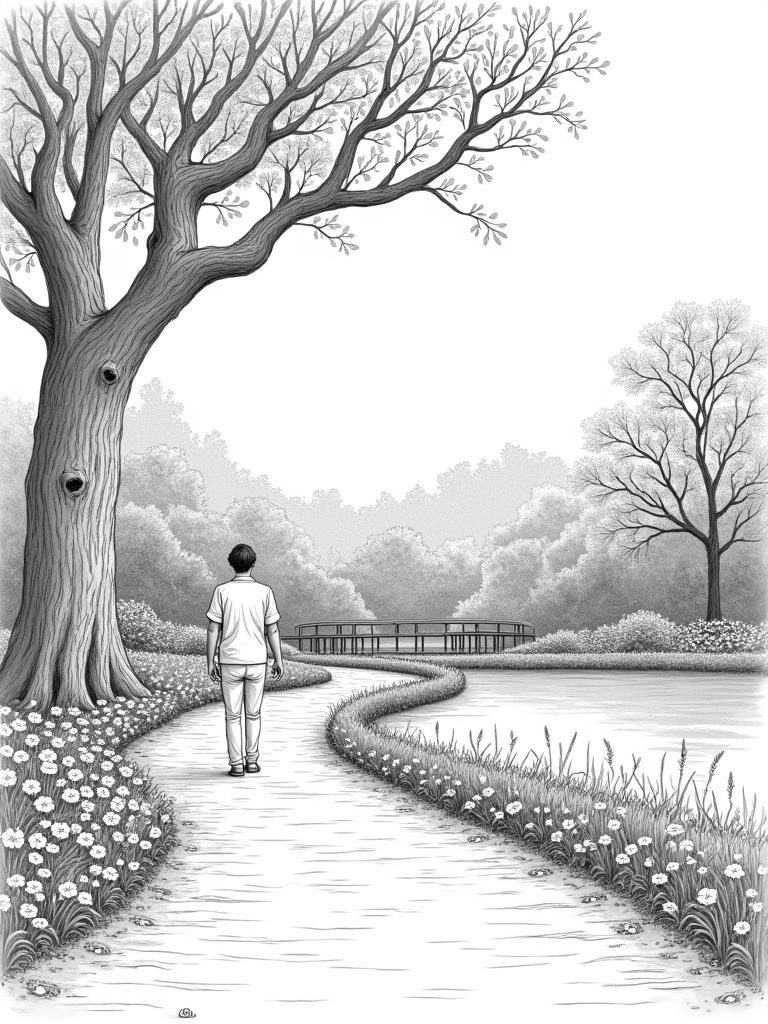 A calming nature coloring page for adults featuring a lone man walking along a winding garden path. Includes lake reflections, large trees, bridge, flowers, and peaceful landscape details. Designed for mindfulness, reflection, and stress relief. Perfect for nature lovers, meditation pages, and therapeutic adult coloring activities.