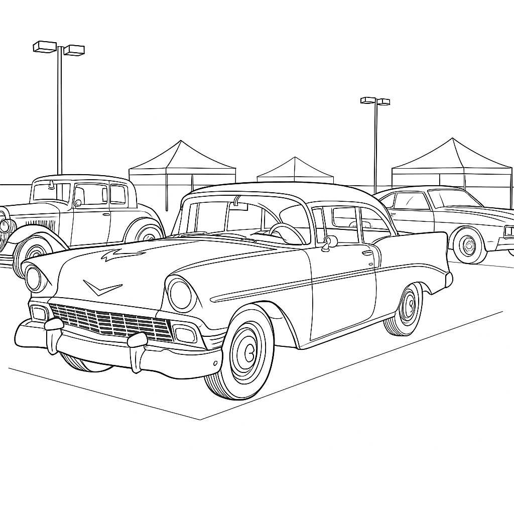 This adult coloring book page displays a diverse array of classic cars, capturing the essence of a vintage car show. Perfect for car enthusiasts, it offers an intricate design ideal for A4 printing and creative coloring.